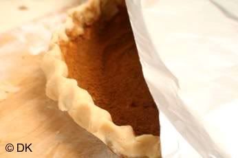 5.Place some pie weights and then place in the oven , to bake for about 25min. remove the weights and then bake for 8 more minutes. Cool to room temperature before pouring in the filling.