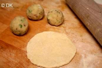 4.Now make round balls of the dough and roll it into a circle using a rolling pin, a little bigger than the filling balls.