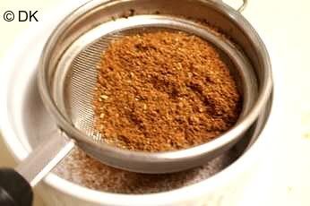 3.Now with a sifter, sift the masala into a dry bowl. At this point, you can grind them remaining ones again. Few husks from cardamom will be sifted. Remove and throw them away.Store the masala in an air tight container. Make them in smalla quantities to retain the freshness and aroma. It lends a special taste to your food.