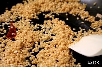 1.In 1/2 tsp of oil, saute Black gram, chillies, pepper for 1-2 min till the aroma hits you.