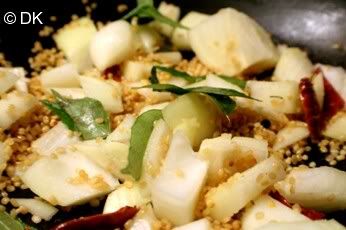 2.Now add chopped onions, salt and asafoetida and saute some more till the onions are soft. Just before switching off the flame add the curry leaves and tamarind and saute for - say about 30seconds.